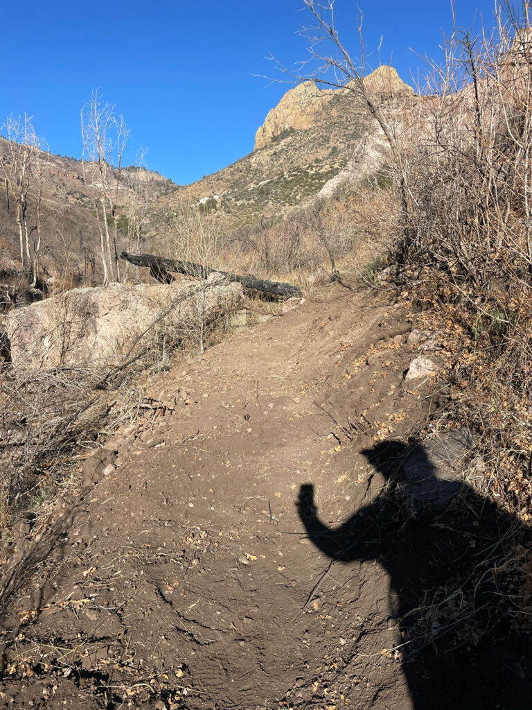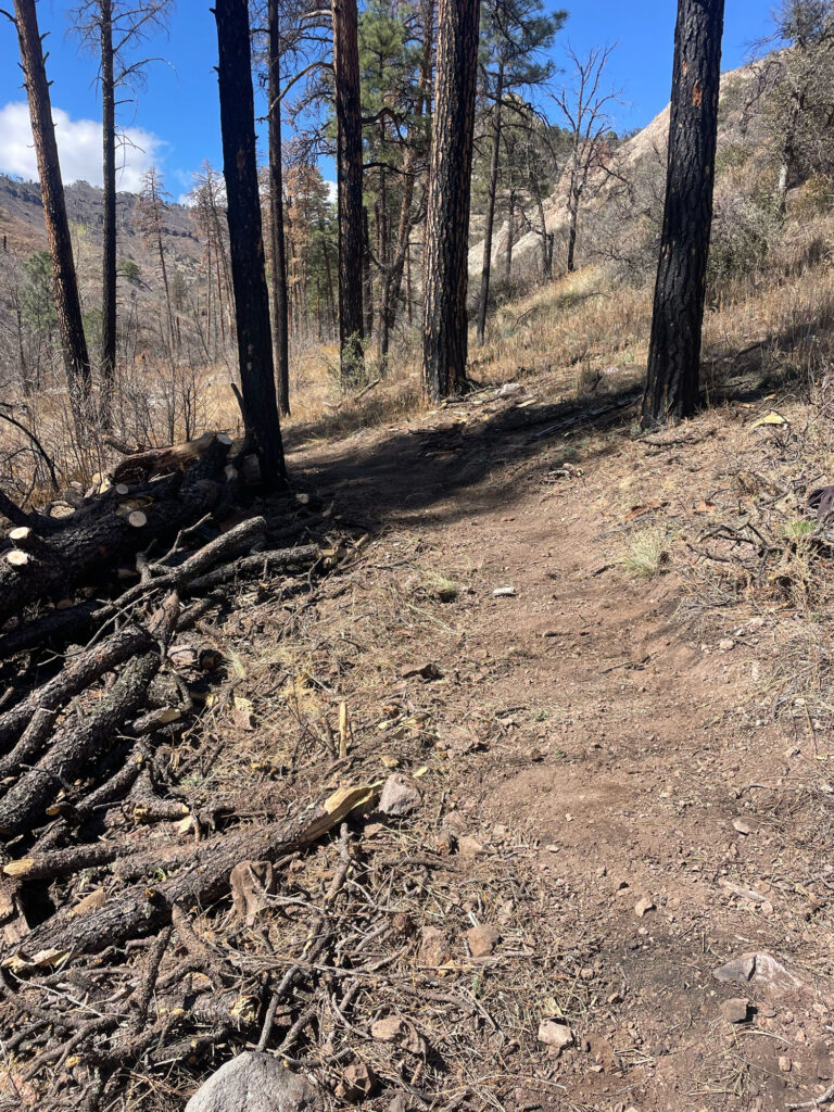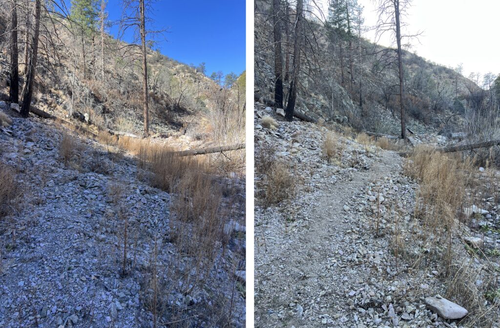 In 2022, the Black Range experienced the second largest wildfire in New Mexico history to date, the Black Fire. While direct evidence was minimal early on our drive and hike in, significant flood damage in the canyon bottom was quickly evident, and the further up canyon we went, the more we started to see burned and increasingly fallen trees.