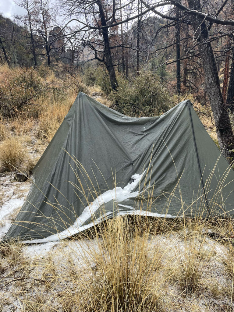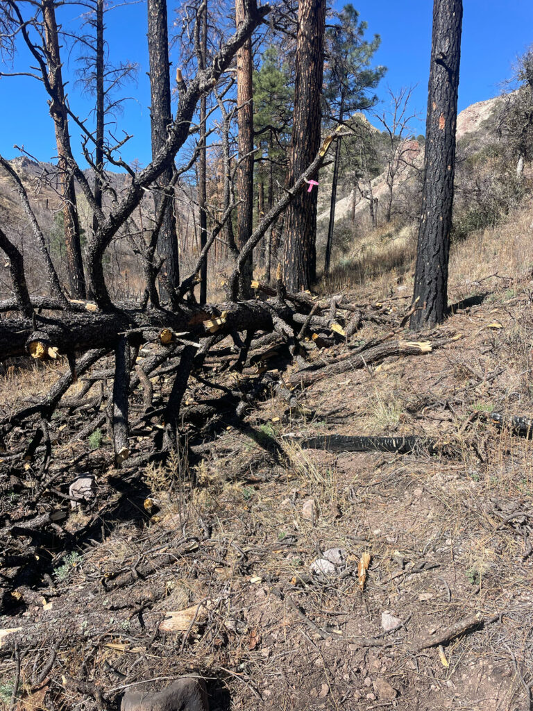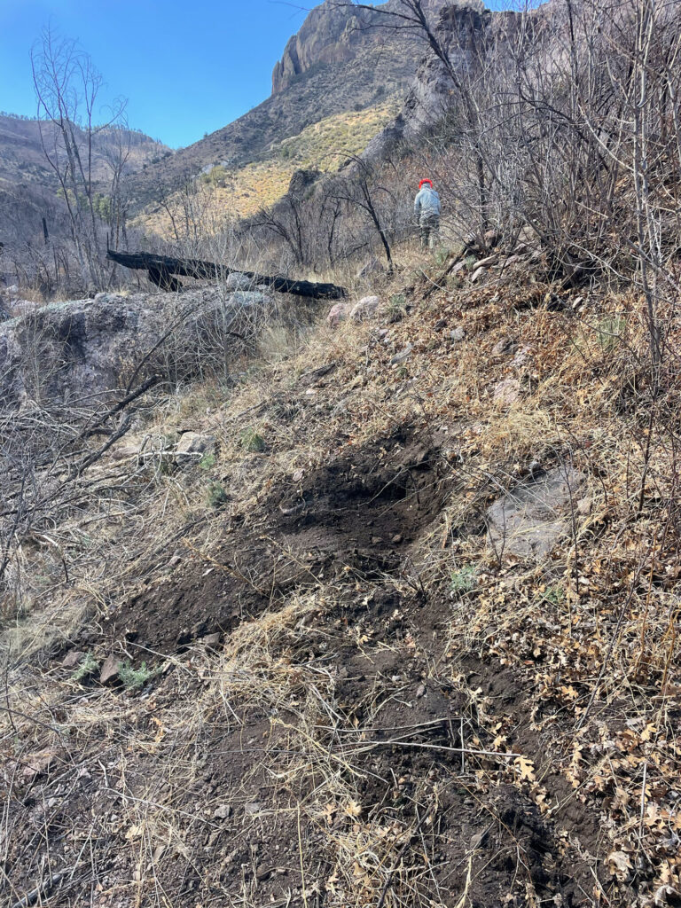 Before venturing into the backcountry, we stopped in Truth or Consequences to pick up a radio from the Black Range District Forest Service Office. Cell phone service drops off in the canyon, and Leopold’s vision of a wilderness area feels more complete in these pockets of service silence and isolation by modern communication standards. We drove in on long, winding and very scenic roads, ending up at the trailhead for the Circle Seven Trail, where we donned our packs and hiked nearly 3 miles to near the end of previous work on this trail, set up camp, and began work the next day.