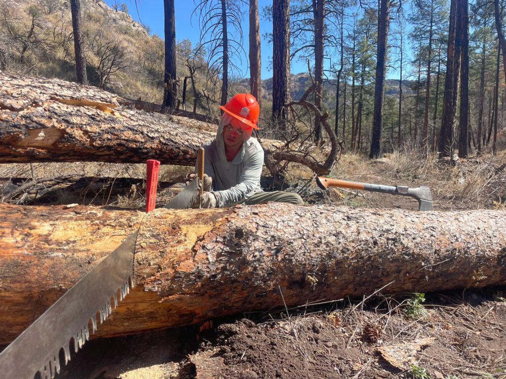 Eric and Rebekah crosscut a log off the trail. Photo by Rebekah Sutherland.