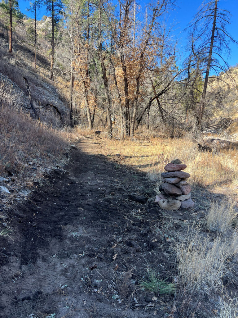 We set out working our way up canyon, routefinding, flagging, brushing, crosscutting logs, and spending the bulk of our time digging tread to redefine connections between existing trail, building new creek crossing ramps, building large cairns to help people navigate creek crossings and narrow canyon-bottom portions of trail still at risk of continued flood damage, and generally helping to redefine the trail and make it passable by hikers and pack stock.