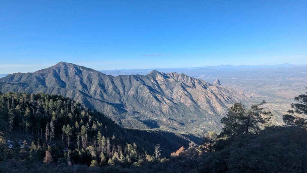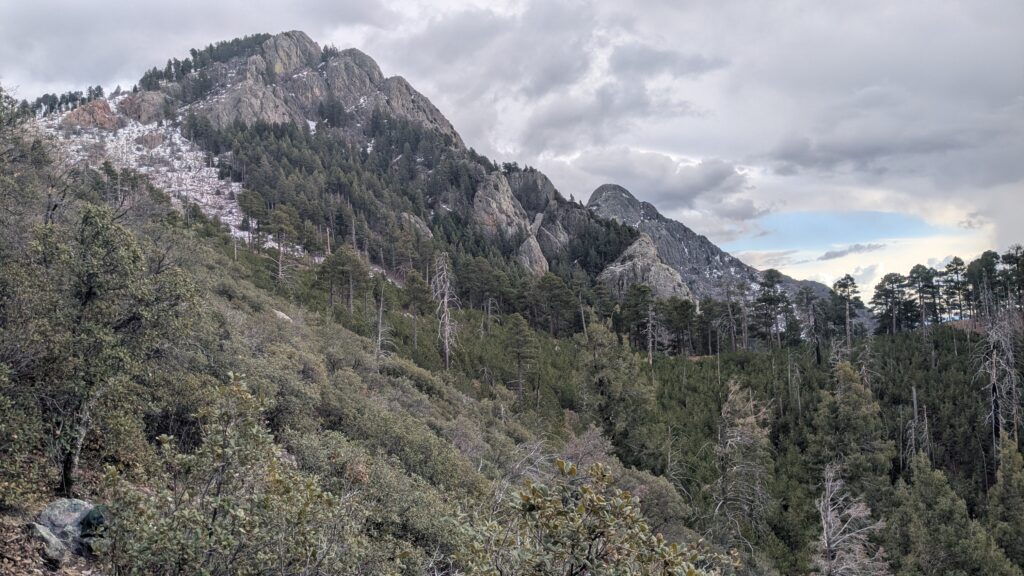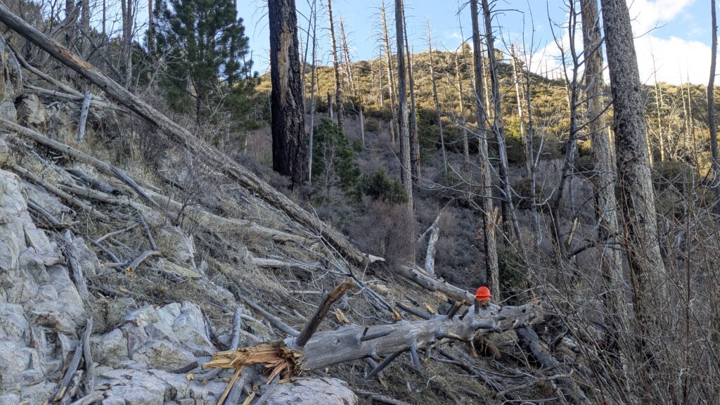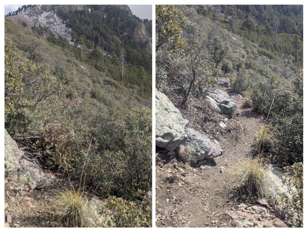 While our other crew was working along the Dry Blue Creek in the Gila National Forest, we were nestled in along the steep slopes of the Santa Rita Mountains in the Mount Wrightson Wilderness of the Coronado National Forest. Our work, focusing on the Four Springs Trail #940 high above Madera Canyon, was aimed at brushing the trail corridor of creeping vegetation, improving the tread in places of need, and removing downed logs.