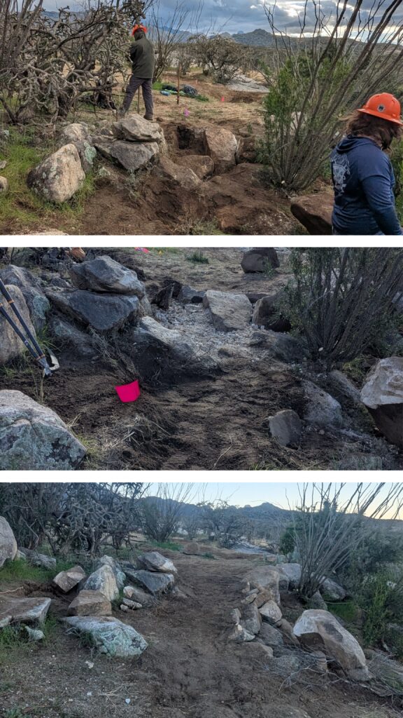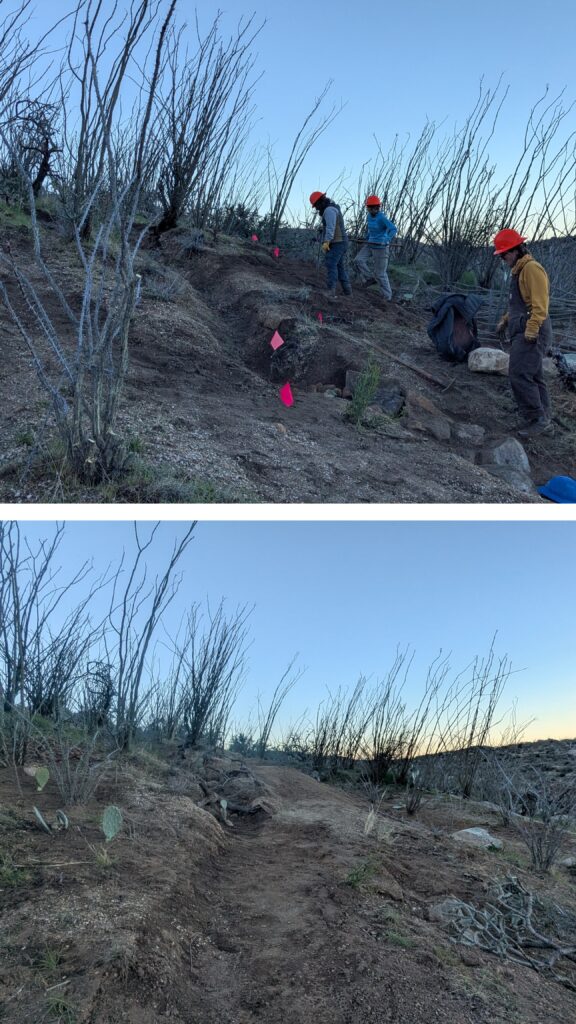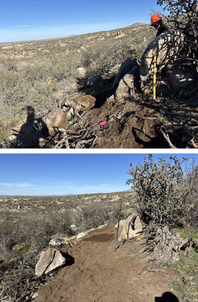 On our first hitch back of the new year, some of us returned to the place of our last hitch of last year: the Santa Catalina Mountains, east of the Golder Ranch area of Oro Valley. We continued our work rerouting certain sections of the Cow Pies social trail as part of its adoption into the official trail system as the new Stone Cactus Loop trail. Horseback riders, mountain bikers, hikers, and the occasional cow all use the trail, which is part of the greater Golder Ranch area trail system.