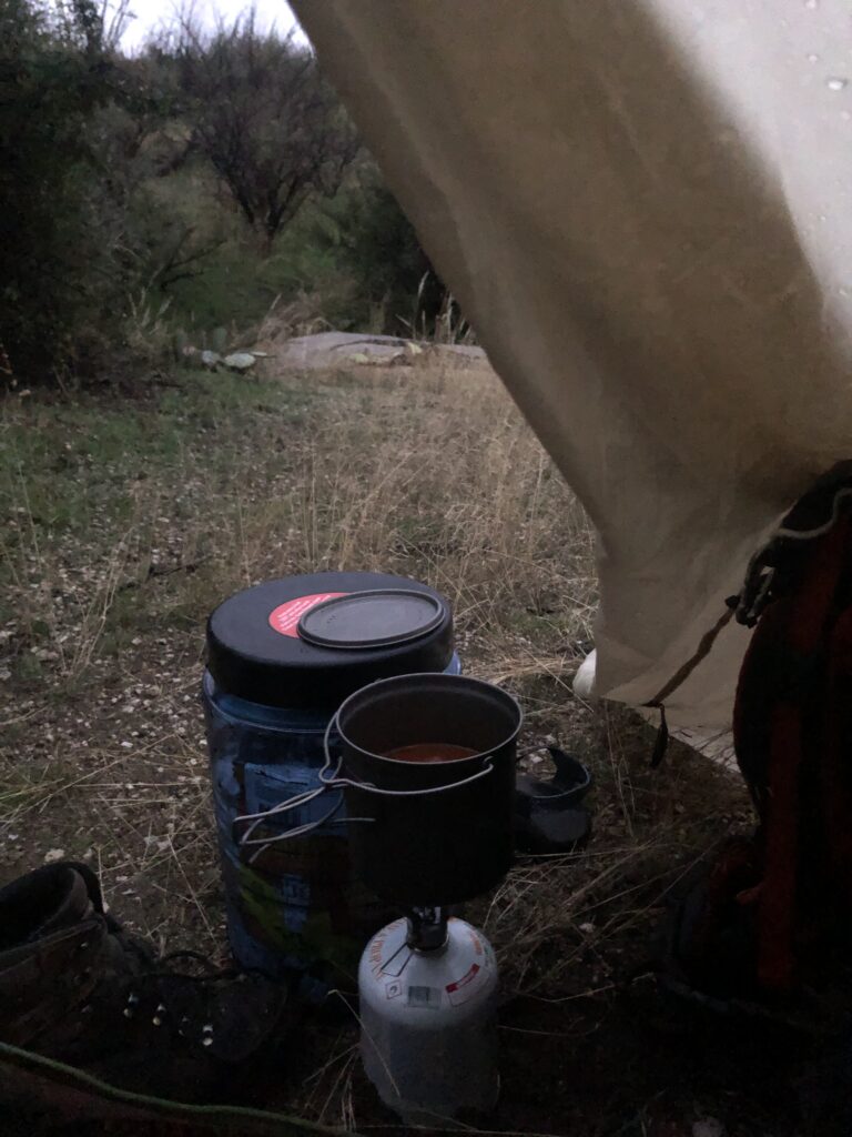 We were blessed with rain the first two days of hitch and ate dinner in our tents. Overnight the rain turned to snow on the peaks around us.