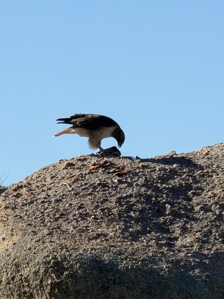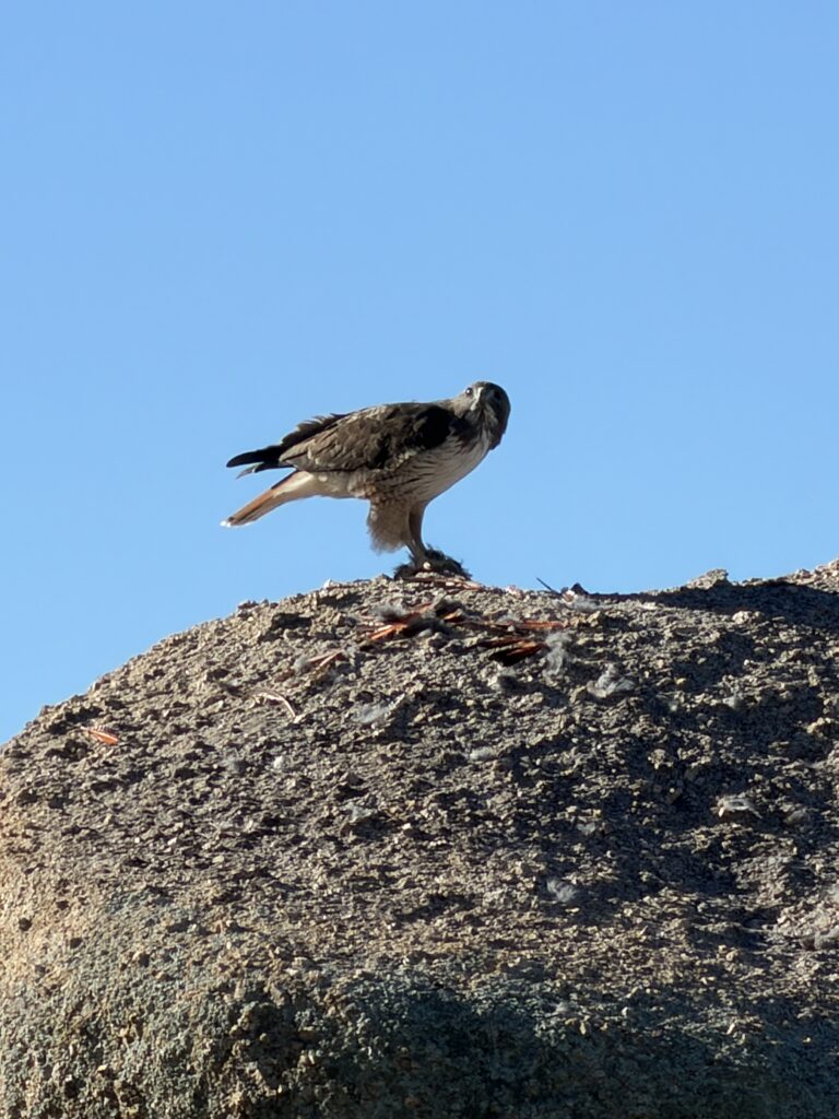A red-tailed hawk soared over us on the last day of work, landing nearby on a rocky outcropping. The hawk began ripping into its prey, releasing a cloud of feathers. Davis captured some incredible close-up photos of the hawk, highlighting its steely-eyed stare and wicked beak.