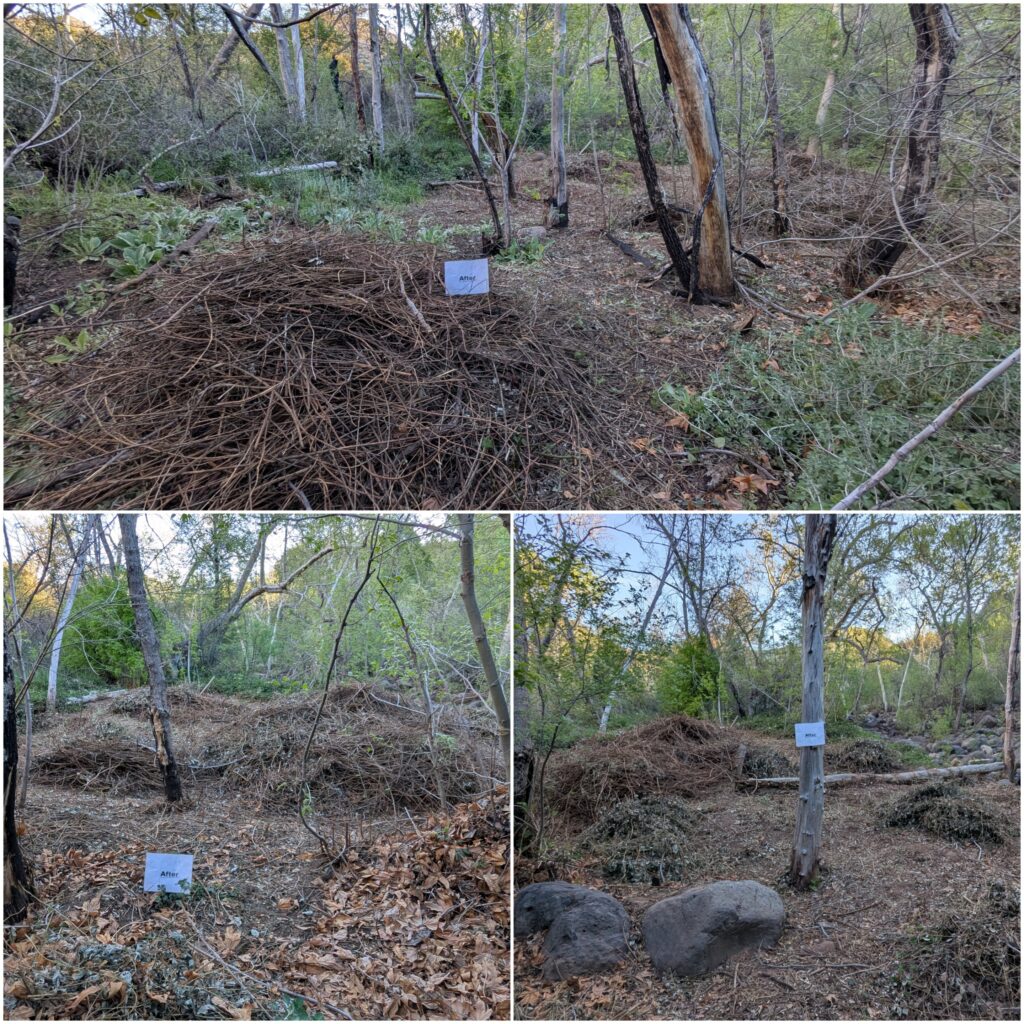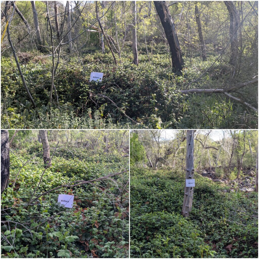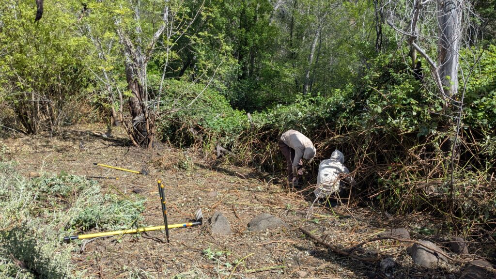 In total we cleared 0.11 acres of Blackberry, cutting and applying herbicide to 17,282 stems in total. We spent three days working in the highest upstream patch of Blackberry (site 1) removing 0.08 acres and dabbing 9,993 stems with herbicide. We then spent three days working near the main public camping area (site 2) removing 0.03 acres and dabbing 7,289 stems with herbicide. Site 2 was more technical due to working around native Box Elders and removing downed trees to access the Blackberry.